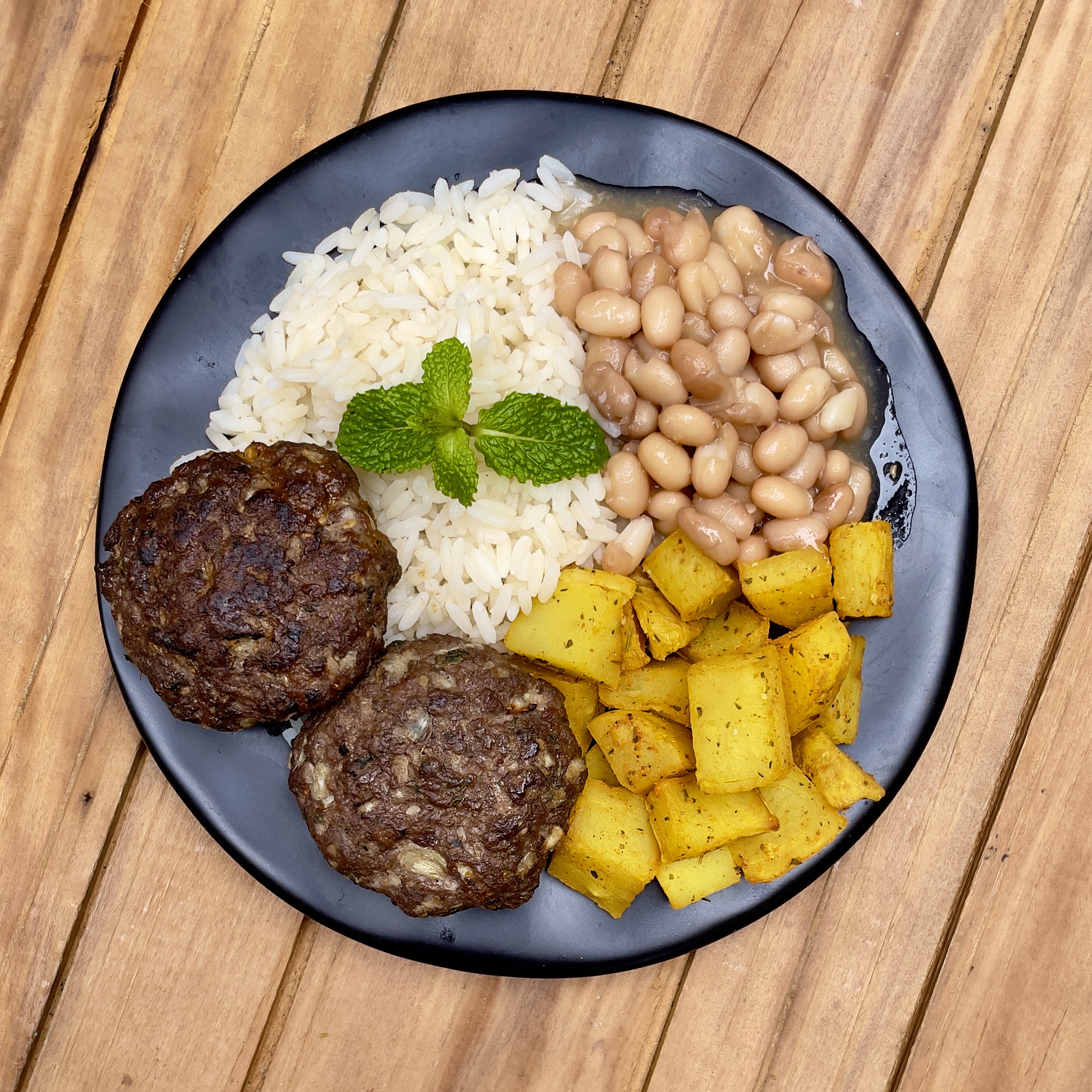 NÃO CONTÉM GLÚTEN. NÃO CONTÉM LACTOSE. Ingredientes: patinho moído, arroz parboilizado, feijão carioca, batata inglesa, cebola, alho, lemon pepper, hortelã, suco de limão, zaatar, pimenta síria, páprica defumada e sal marinho. Sem conservantes, sem corantes e sem aditivos químicos. |